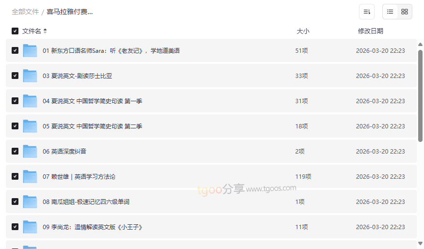 这份精心整理的 喜马拉雅付费外语音频课资源合集,堪称语言学习者的“移动图书馆”。它汇集了多位名师、覆盖了从地道口语、经典文学、哲学思辨到实用留学、音标发音、单词记忆等全方位、多维度的外语学习内容。本资源最大的价值在于,它将原本需要付费订阅的精品课程整合为可离线学习的音频与文档,让学习者可以随时随地利用碎片化时间,系统性地提升外语综合能力,尤其适合追求高效、灵活学习路径的现代人。这套高质量网盘资源合集,无论是对于备考、兴趣提升还是出国深造,都提供了坚实而丰富的学习支持。