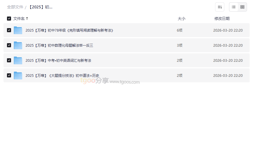 “万唯”系列教辅以其紧扣考情、方法精炼的特点,已成为众多初中生及家长信赖的备考利器。本次分享的【2025初中万唯合集】资源,汇集了针对新中考趋势的核心专项突破资料,包括英语完形阅读、数理化母题、英语词汇以及道法历史大题技法。这套资源精准覆盖了初中学习中的重难点与薄弱环节,通过科学的题型归纳与高效的解题方法,旨在帮助学生从“题海战术”转向“方法制胜”。无论是用于日常同步巩固、寒暑假查漏补缺,还是初三总复习冲刺,这套高质量的网盘资源合集都能提供系统性的学习支持,是提升应试能力的“秘密武器”。