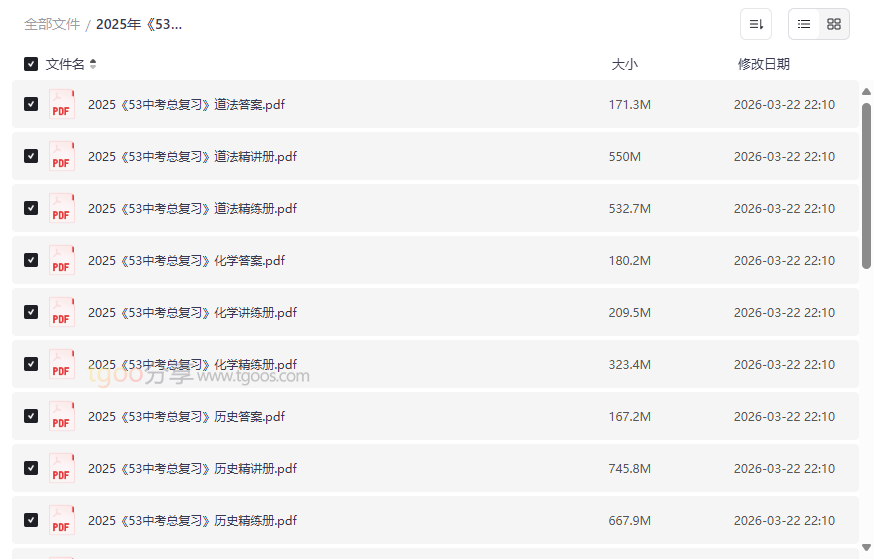 《五年高考三年模拟》系列作为教辅领域的金字招牌,其针对中考的《53中考总复习》更是无数初三学子备考路上的“神兵利器”。本次分享的 2025年《53中考总复习》7科全套(全国版),汇集了语文、数学、英语、物理、化学、道德与法治、历史全部科目,不仅包含核心的讲练册与精练册,还配备了详尽的答案解析及针对性的专项突破材料。这套资源的价值在于,它通过“讲、练、测、评”一体化的科学设计,系统梳理中考考点,精准对标全国中考命题趋势,是帮助学生高效复习、实现成绩突破的权威资料库。本套高质量网盘资源特别适合: