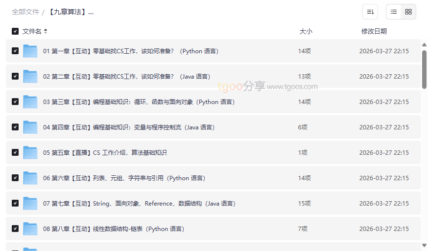 “九章算法”是北美及国内技术求职领域广受认可的算法培训品牌,其基础班课程专为零基础或转专业求职者设计。本资源集合了 Python与Java双语言版本的完整视频教程、配套源码课件以及手把手代码带写环节,系统覆盖了从编程入门到算法面试的核心知识点。这套高质量网盘资源合集将帮助学习者构建坚实的计算机科学基础,并高效备战技术面试,尤其适合: