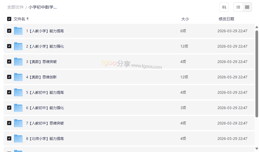 数学是思维的体操,而一套系统、优质的学习资源则是攀登数学高峰的阶梯。本资源集合了覆盖小学至初中全学段的人教版、北师大版、苏教版三大主流教材体系,并深度融合了由“高斯数学”和“爱学习”等知名教育品牌打造的能力提高、能力强化、思维突破、思维创新四大进阶模块。无论是夯实校内基础,还是挑战奥数思维,这份海量网盘资源合集都提供了从启蒙到拔高的完整解决方案。它特别适合: