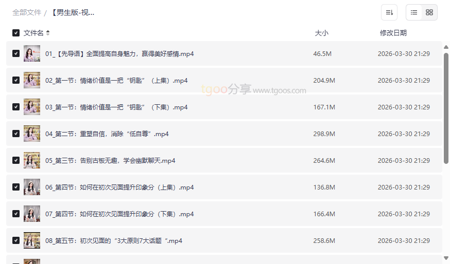 资源地址:《男生魅力成长实操课》15节视频课:情绪价值、自信重塑到关系维护全指南