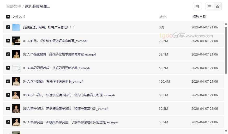 在人工智能浪潮席卷全球的今天,如何利用AI技术赋能家庭教育,已成为现代父母的“必修课”。本套《家长必修AI课》资源,精准聚焦于 “科学育儿” 与 “技能变现” 两大核心维度,系统性地为家长提供了从理念革新到实践落地的全套解决方案。课程不仅涵盖了AI个性化教育方案定制、AI辅助学习习惯养成、AI亲子游戏与科学实验等前沿育儿方法,更拓展至AI自媒体变现、AI写作与剪辑等副业创收技能,堪称一份面向未来家庭的“数字育儿与成长宝典”。这套高质量网盘资源合集旨在帮助家长: