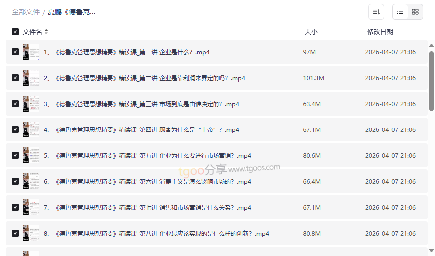 “现代管理学之父”彼得·德鲁克的思想,是每一位管理者和商业思考者的必修课。然而,其著作体系庞大,思想深邃,让许多初学者望而却步。本资源——夏鹏《德鲁克管理思想精要精读课》,正是为解决这一痛点而生。它由知名知识传播者夏鹏老师领读,通过 27节系统视频课程,将德鲁克经典著作《管理:任务、责任、实践》的核心思想进行拆解、精炼与现代化解读,化繁为简,直击管理本质。这套高质量网盘资源不仅是对原著的导读,更是一场结合当下商业环境的思维训练,适合: