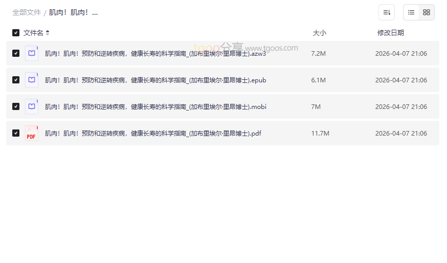 在追求健康与长寿的道路上,我们往往关注体重、体脂或心肺功能,却忽略了身体最核心的“发动机”——肌肉。《肌肉!肌肉!预防和逆转疾病,健康长寿的科学指南》 正是这样一本颠覆传统健康认知的力作。本书由功能医学专家加布里埃尔·里昂博士撰写,系统性地揭示了肌肉质量对于预防慢性病、提升代谢、延缓衰老乃至延长寿命的关键作用。本资源集合了 AZW3、EPUB、MOBI、PDF 四种主流电子书格式,为不同设备的阅读者提供了极大便利。这份高质量的健康科学指南尤其适合:
