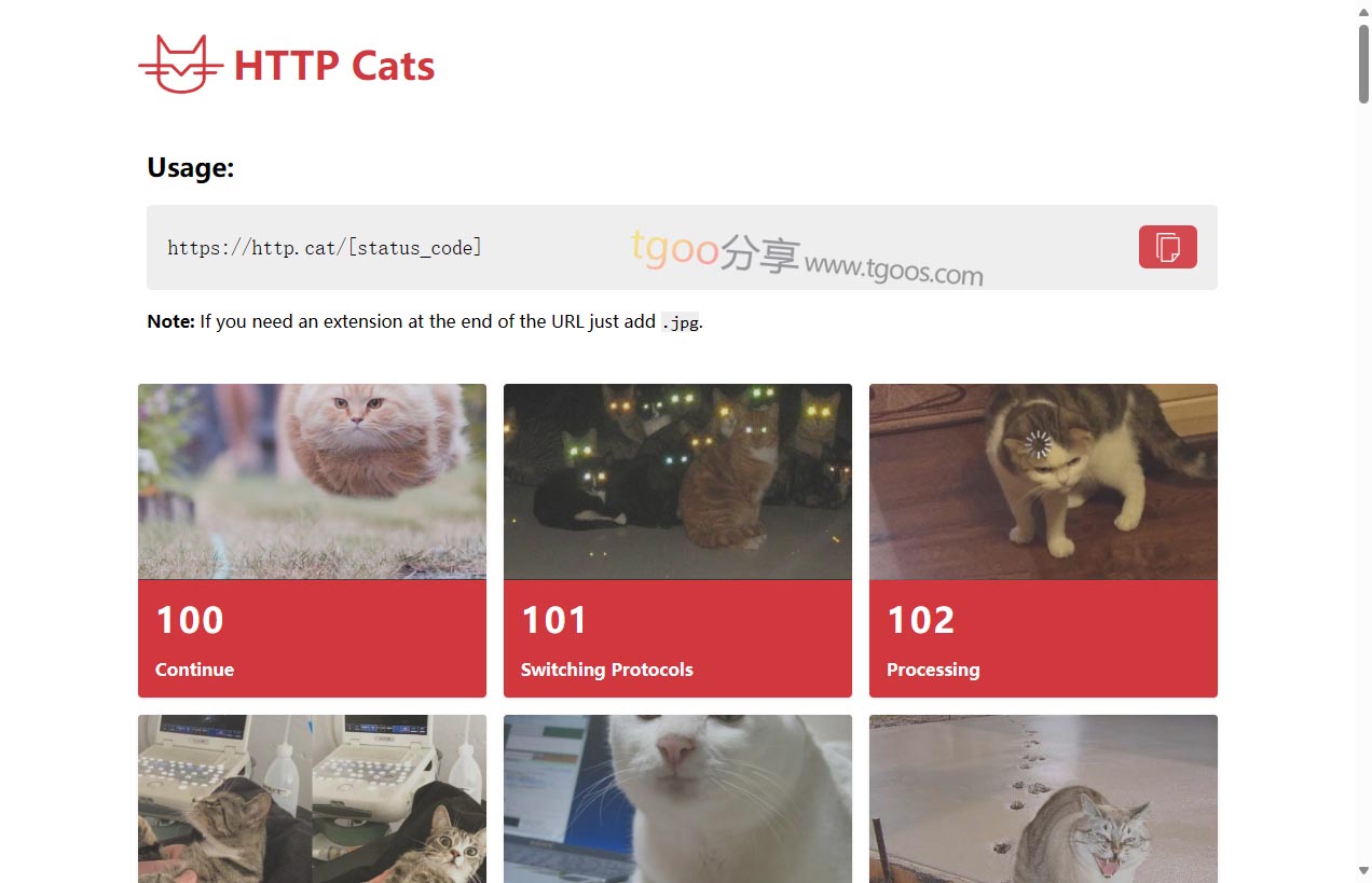 - API集成调用:面向开发者提供简洁的API接口,支持通过URL直接获取特定状态码的猫咪图片,可嵌入网站错误页面或内部工具中。典型场景如自定义404错误页、API文档的状态码示例展示,提升用户体验与互动性。