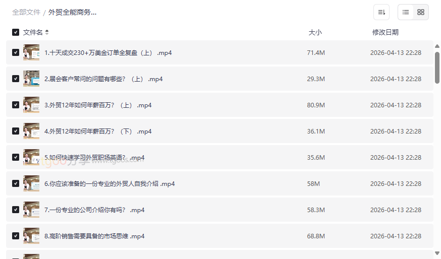 这份名为“外贸全能商务英语课,学完=轻松谈生意 轻松拿订单”的网盘资源合集,堪称外贸从业者的实战宝典。它并非传统枯燥的英语教材,而是将外贸实战场景、高阶销售思维、跨文化沟通技巧与精准商务英语话术深度融合的系统性课程。课程内容源自资深外贸专家的真实经验,覆盖了从客户开发、展会实战、工厂接待、价格谈判到客情维护、职业发展的全链路外贸业务。本资源的价值在于,它提供了大量可直接“抄作业”的英文话术和应对策略,将复杂的商务沟通拆解为可执行的步骤,帮助学习者快速提升外贸谈判能力和订单转化率。