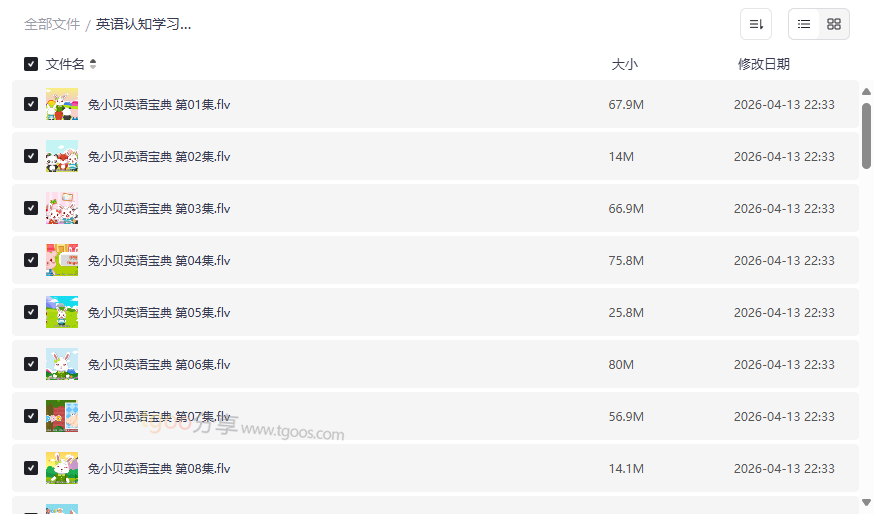这是本资源的核心亮点。每一集都围绕一个核心主题,通过“兔小贝”的故事展开。枯燥的单词和句子被巧妙地编织进探险、游戏、解决问题等有趣的情节中,让孩子在观看动画的过程中自然吸收。同时,资源中包含了大量朗朗上口的英语启蒙儿歌,节奏明快,重复性强,极大地有助于孩子的记忆与模仿,是培养英语语感和发音的绝佳方式。 - 全高清FLV视频格式,适配多种场景
