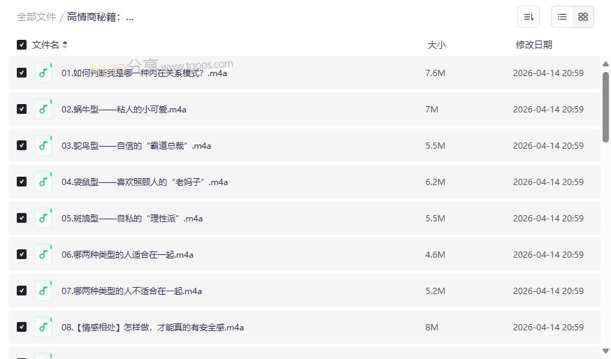 在快节奏的现代社会中,人际关系的复杂程度常常让我们感到心力交瘁。无论是职场中的沟通壁垒、亲密关系中的摩擦,还是家庭内部的代际矛盾,都考验着我们的情商与应对智慧。这份《高情商秘籍:搞定复杂的人际关系》音频课程资源,正是为此量身打造的系统性解决方案。它基于专业的心理学理论,将复杂的人际互动模式归纳为四种生动的动物原型——蜗牛型、鸵鸟型、袋鼠型、斑鸠型,帮助用户快速洞察自我与他人的行为模式,从而在各类社交场景中游刃有余。本资源集合了32节精华音频,覆盖情感相处、职场沟通、自我成长、家庭关系四大核心模块,提供从认知到实践的完整路径。这份高质量网盘资源非常适合: