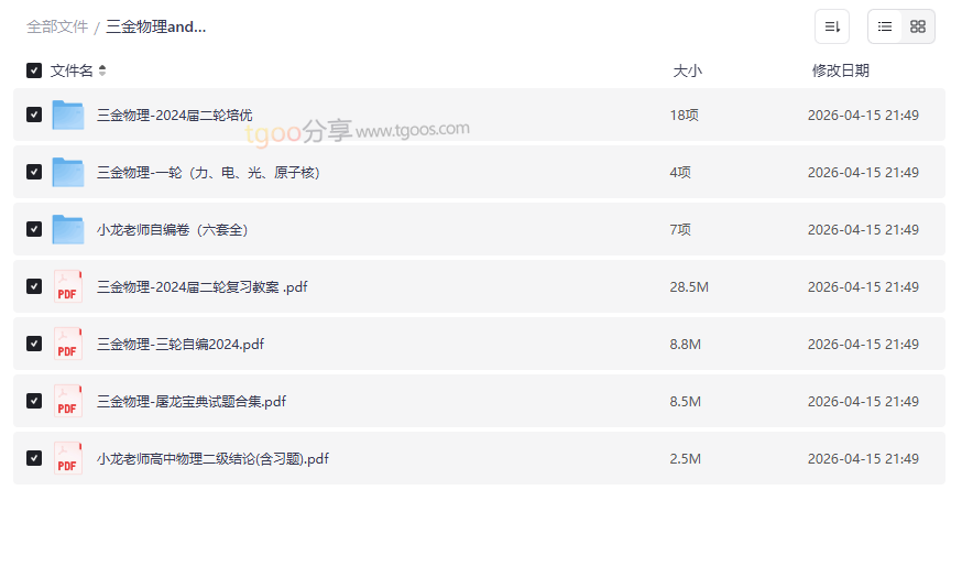 对于备战高考的高中生而言,一套系统、深入且高质量的复习资料是冲刺高分的关键。本资源集合了备受推崇的 三金物理小龙老师 两位名师的核心讲义、教案与自编试卷,内容覆盖高中物理一轮、二轮、三轮全阶段复习,并包含独家整理的二级结论模拟试题。这套高中物理网盘资源以其体系化的知识梳理、针对性的能力拔高和实战化的模拟训练,为物理学习提供了从基础巩固到能力突破的完整解决方案,尤其适合: