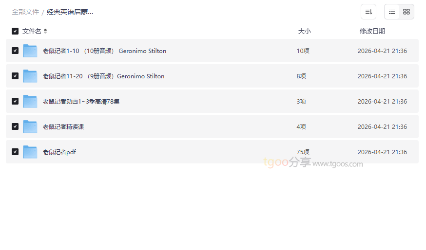 《老鼠记者 Geronimo Stilton》是全球知名的儿童文学与英语启蒙经典,以其幽默风趣的冒险故事、生动可爱的角色和独特的图文排版风靡世界。本资源集合了 全套原版PDF绘本、1-3季共78集高清动画、1-20册核心故事音频,以及配套的精读课程,构建了一个从“兴趣输入”到“系统学习”的完整英语习得闭环。这套高质量网盘资源合集尤其适合: