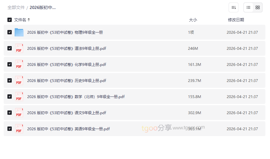 “53初中试卷”作为教辅界的常青树,以其紧贴考纲、题型经典、难度适中的特点,成为无数初中生巩固基础、备战考试的得力助手。本资源集合了 2026年最新版《53初中试卷》全科目电子版,涵盖了九年级上册及全一册的核心科目,包括语文、数学(北师版)、英语、物理、化学、历史、道法(道德与法治),为即将面临中考的学子提供了一套系统、权威、便捷的复习资料。这套高质量网盘资源合集的价值在于其时效性与全面性,将传统纸质教辅数字化,方便学生随时随地查阅、打印和练习,极大提升了学习效率。它尤其适合: