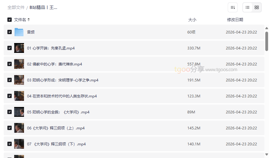 这是本资源的一大亮点。目录中清晰分为 MP4视频 与 MP3音频 两个独立分区。视频版适合端坐书桌前,看王老师神采飞扬的板书与讲授;而音频版则是被精心截取出来的“纯享版”,删去了课间停顿、板书等待的时间。你可以将音频导入手机,在通勤路上、做家务、运动时“磨耳朵”,反复“格”其中一句道理,真正做到“日用常行间,皆是良知实学”。 - 实战性“功夫条理”:在事上磨练