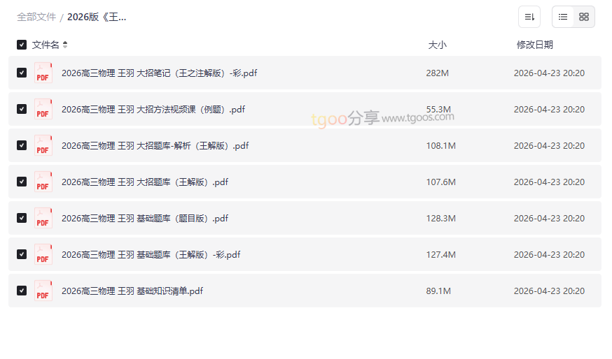 这部分资源虽然以PDF形式呈现,但核心是服务于视频课程的“方法课”配套例题。- 2026高三物理 王羽 大招方法视频课(例题):这份文件是王羽老师视频课程中的经典例题集锦,是连接“学”与“练”的桥梁。它选取了最具代表性的例题,用于演示“大招”在实际题目中的应用。建议你将其与视频课程同步使用:先看例题,尝试思考,再观看视频讲解,最后用自己的话复盘解题步骤。通过这样的“刻意练习”,这些物理大招才能真正成为你解题时的本能反应,从而在考场上做到“胸有成竹,下笔如有神”。
