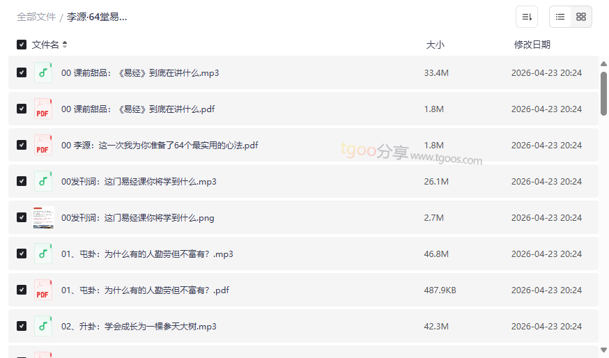 你是否曾在职场、家庭或人际关系中感到困惑,不知道如何做出明智决策?《易经》作为中华文化的源头活水,蕴含着深刻的人生智慧。李源老师主讲的这套“64堂易经情商课”,将晦涩的卦象与经典哲理,转化为64个实用的现代人心法,帮助你应对工作、生活、人际中的实际问题。本资源合集包含完整的音频课程、配套PDF文稿,以及加餐视频与音频,为你提供一套系统的情商提升与思维进阶解决方案,适合: